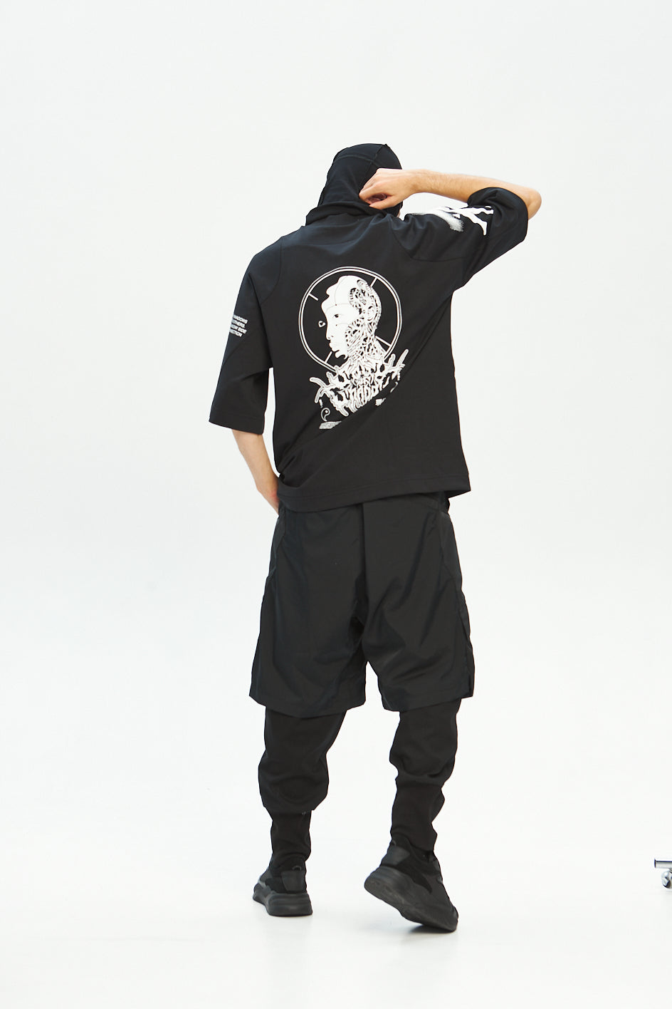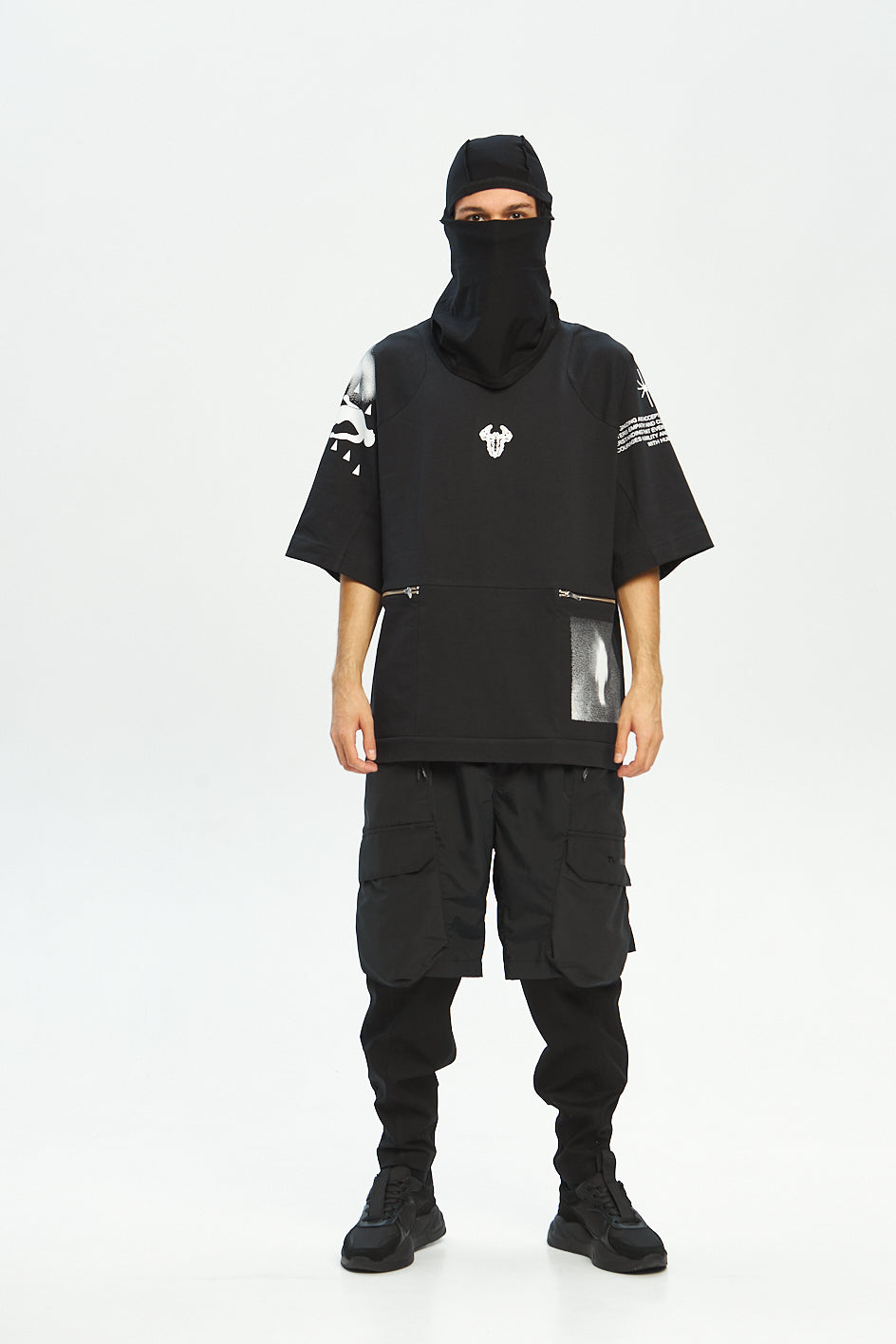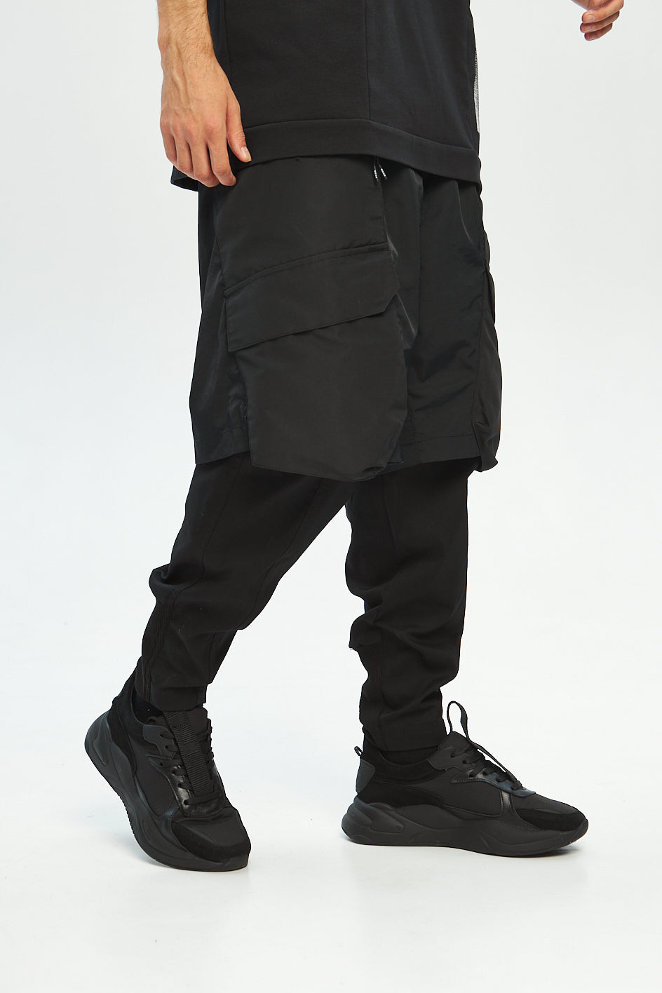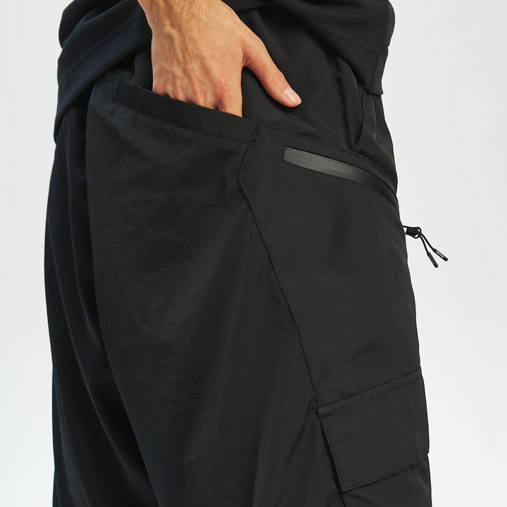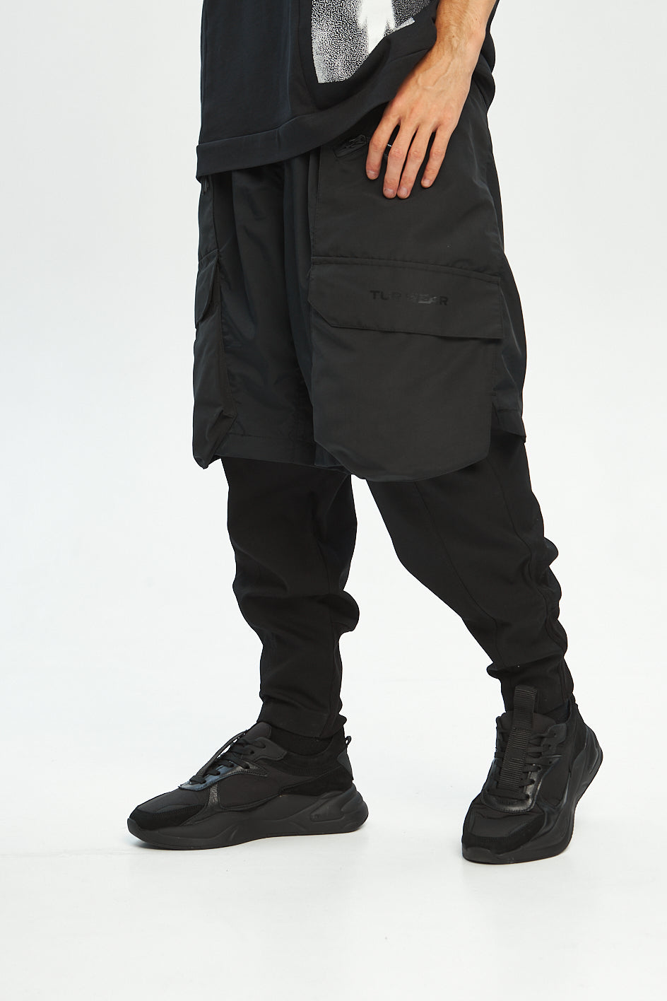 Loose-fit cargo pants made of two functional layers: the top resembles shorts made of crinkled shell fabric, while the bottom consists of pants made from stretch canvas. This layered construction adds volume and creates a unique, multi-dimensional silhouette.