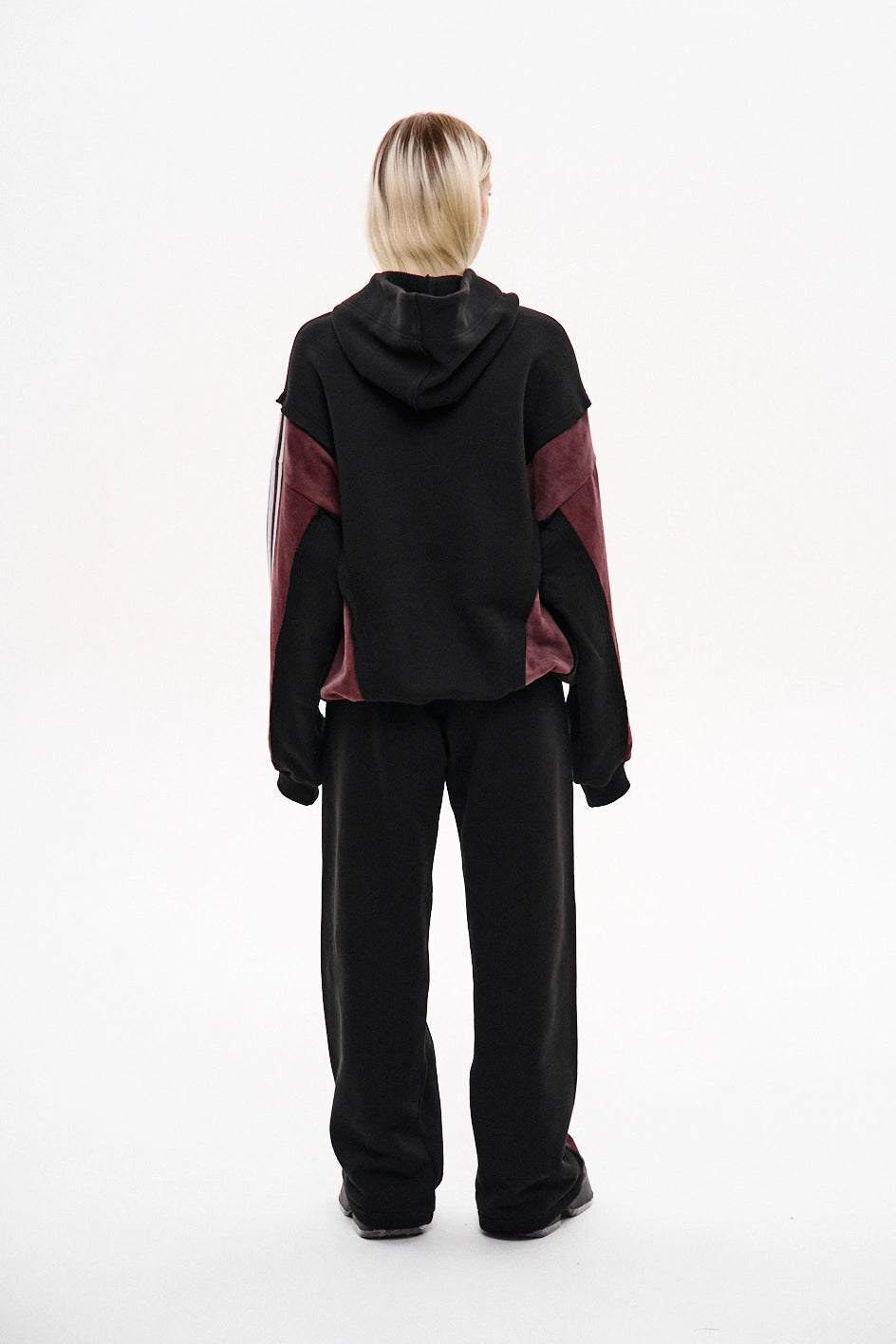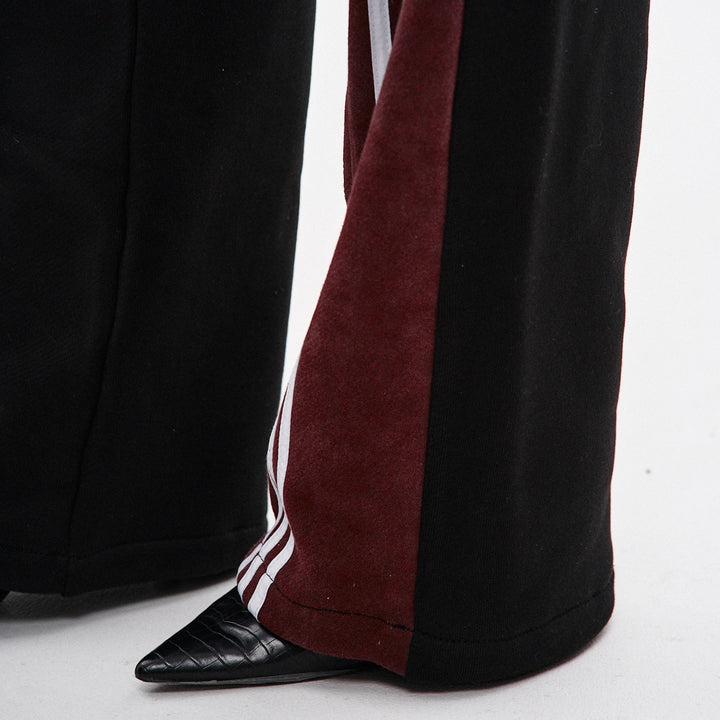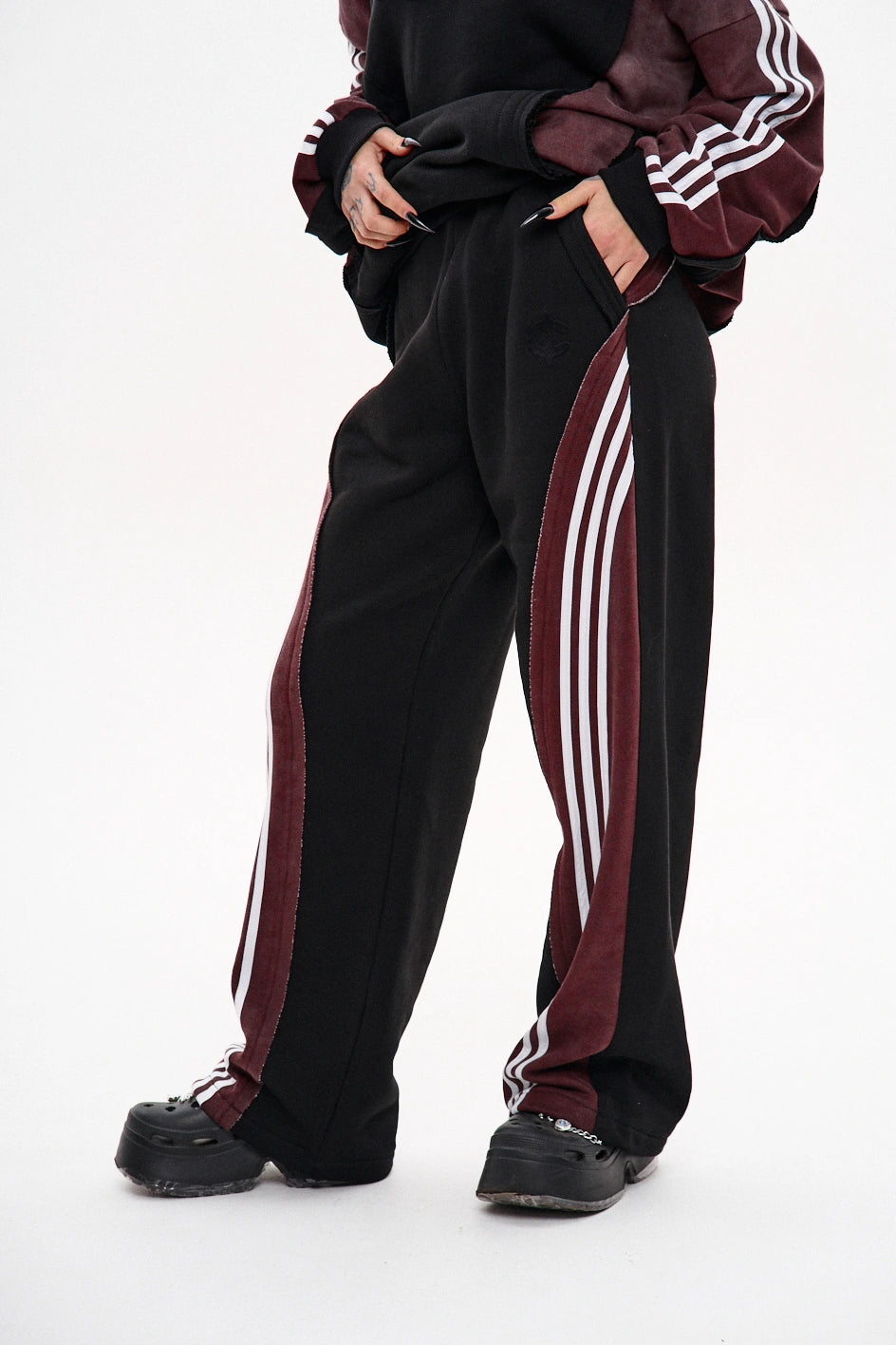 Straight-cut sweatpants made from a combination of two fabric colors: the main part in black and the back yoke in burgundy with raw edges. Each burgundy section features three white stripes on each side. To achieve a vintage effect, the pants have undergone an industrial washing process. The design includes two front pockets, an elastic waistband with a drawstring, and adjustable drawstrings at the hem for a customizable fit. A tonal black embroidered logo is placed on the left side.