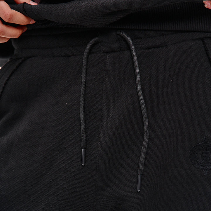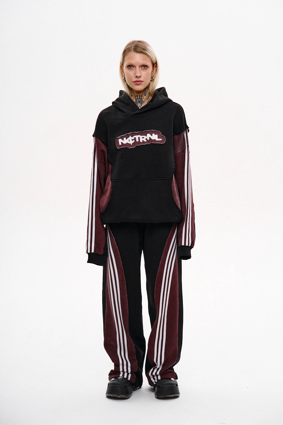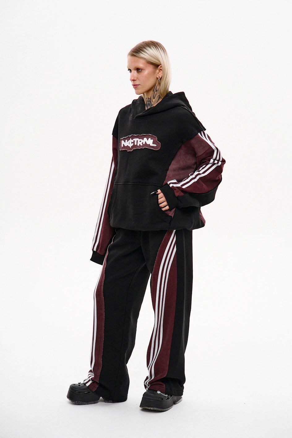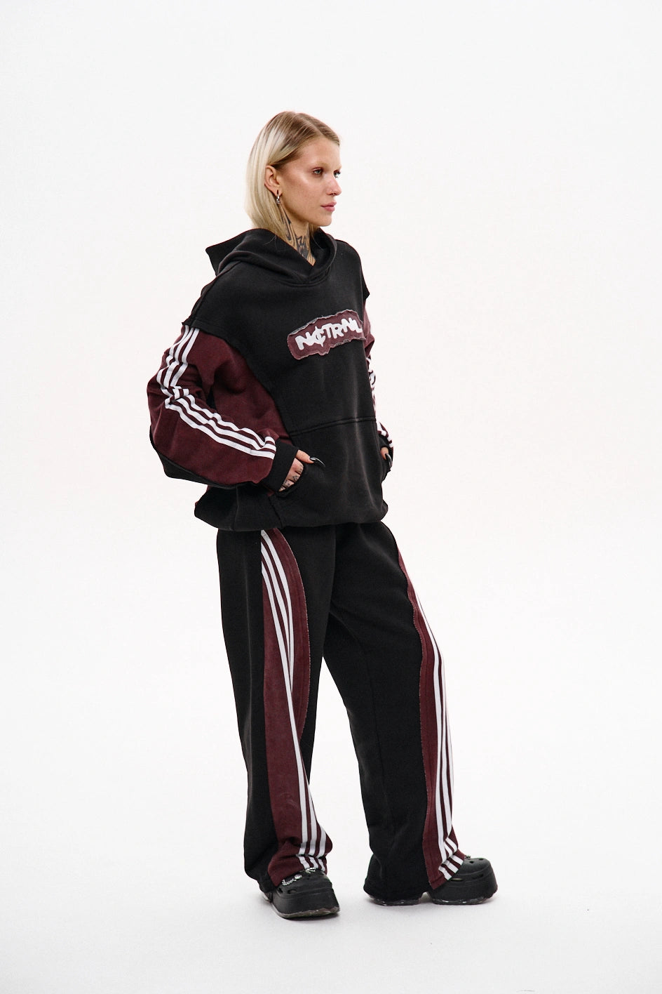 Straight-cut sweatpants made from a combination of two fabric colors: the main part in black and the back yoke in burgundy with raw edges. Each burgundy section features three white stripes on each side. To achieve a vintage effect, the pants have undergone an industrial washing process. The design includes two front pockets, an elastic waistband with a drawstring, and adjustable drawstrings at the hem for a customizable fit. A tonal black embroidered logo is placed on the left side.