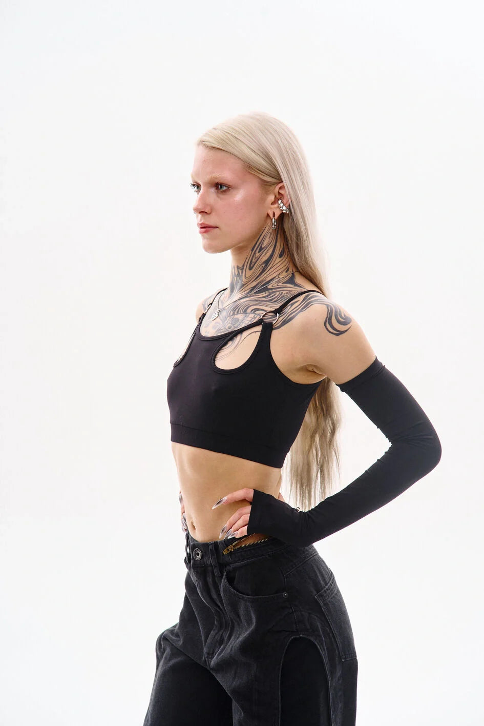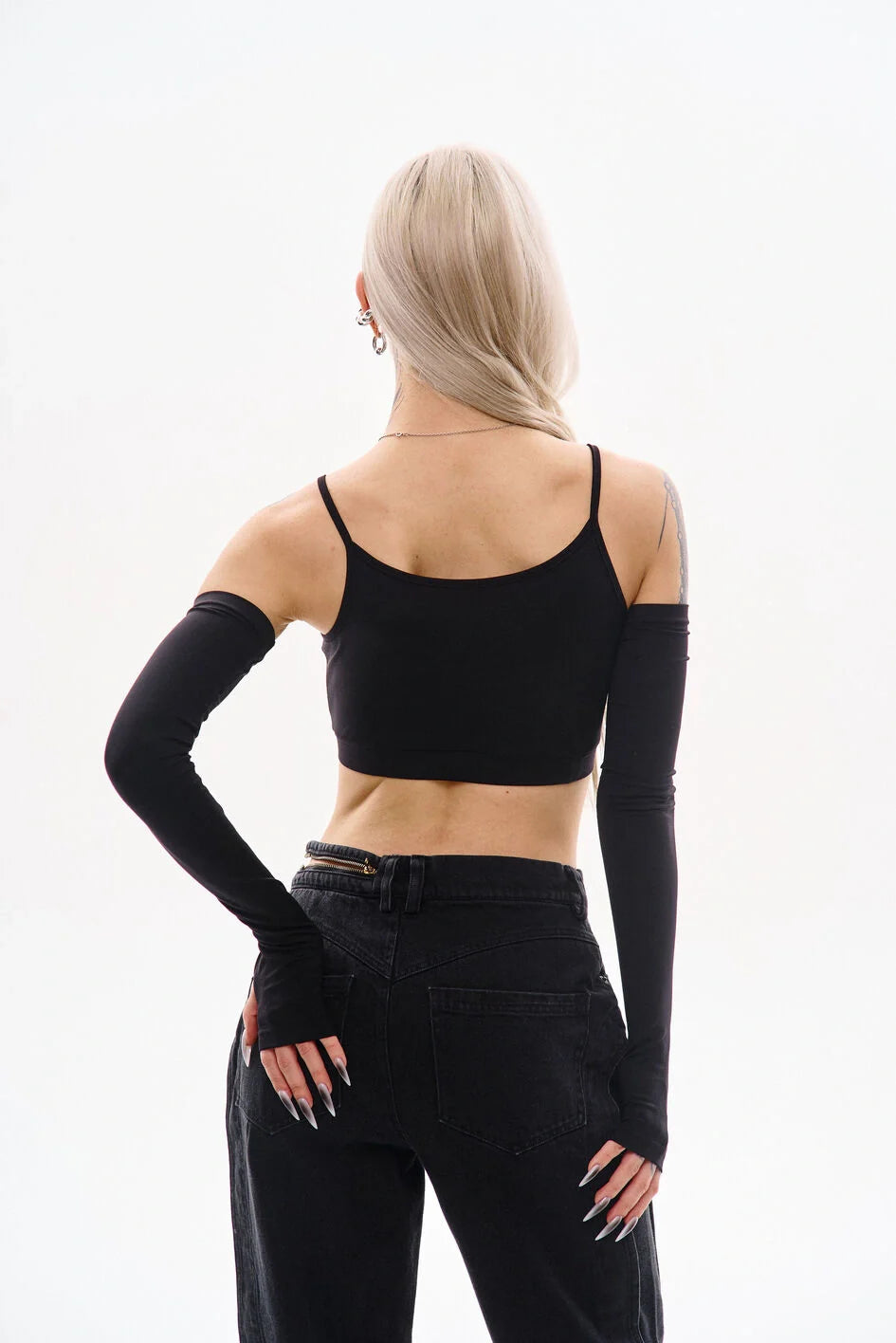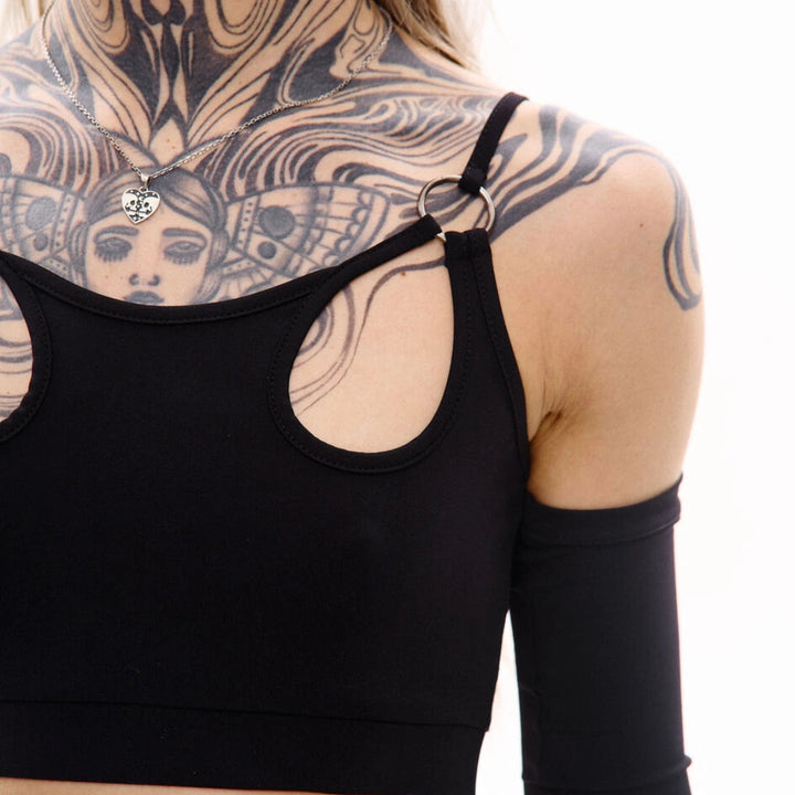 Tank-style top with thin straps made from polyamide jersey. Straps are attached via metal rings. The set includes separate sleeves with thumbholes. A cut-off waistband with an inner elastic ensures a better fit.