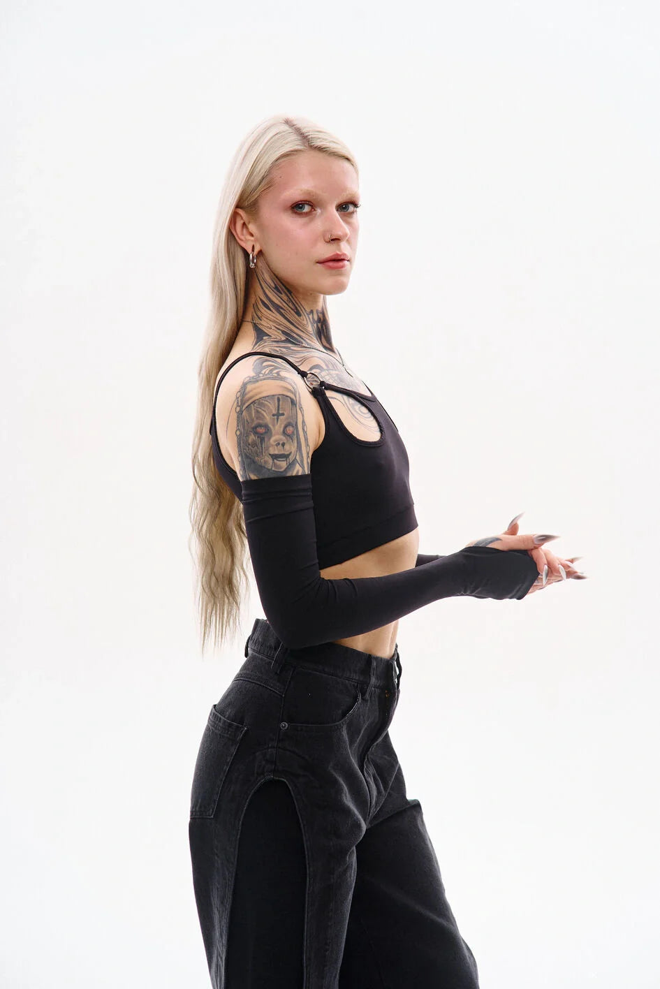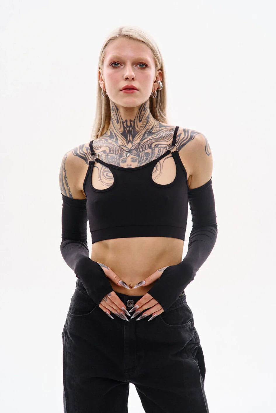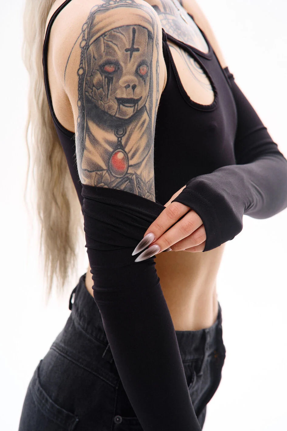 Tank-style top with thin straps made from polyamide jersey. Straps are attached via metal rings. The set includes separate sleeves with thumbholes. A cut-off waistband with an inner elastic ensures a better fit.