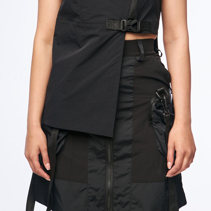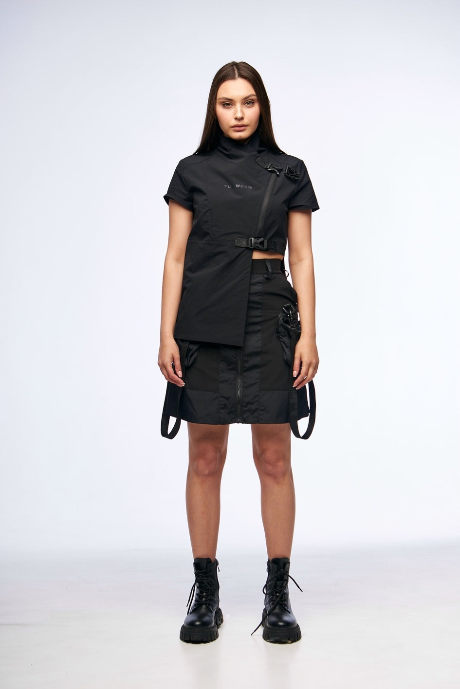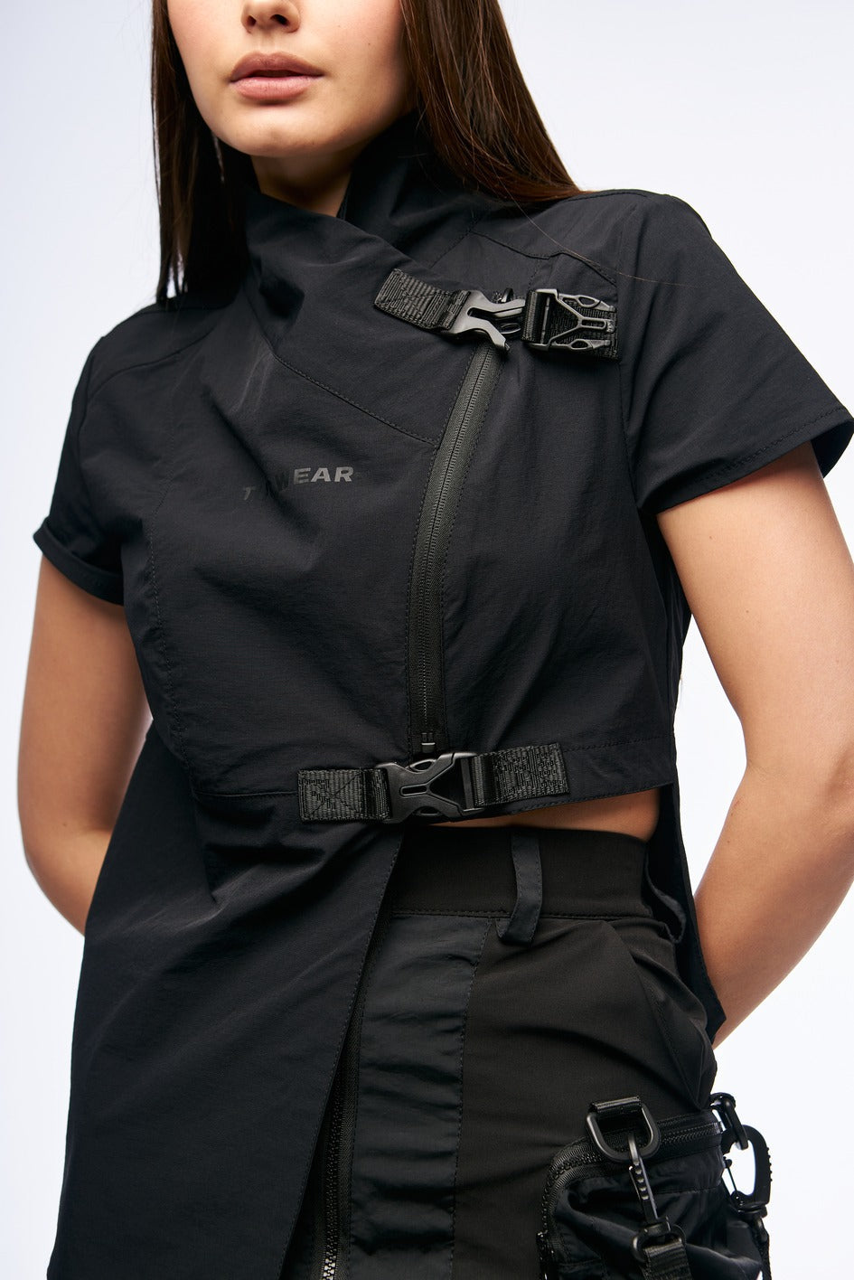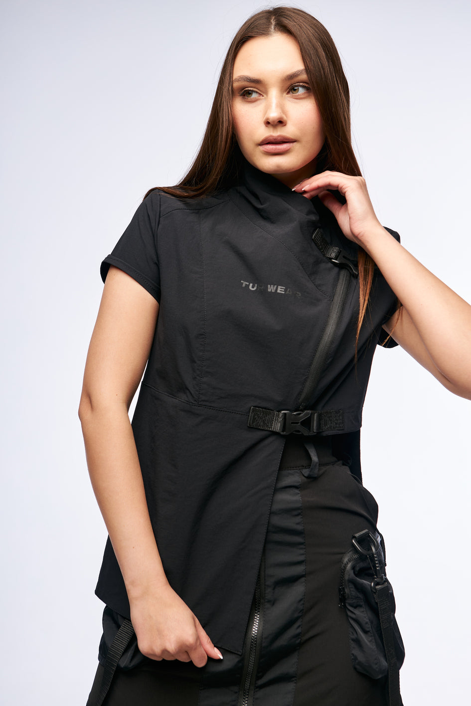 Key model features: Kimono-style top with an asymmetrical cut, made from lightweight 4-way stretch fabric. Fastens with a zipper and features two decorative buckles for extra support. The right side is extended, giving the piece a unique and edgy look. Designed with a high collar and short sleeves for both comfort and style.