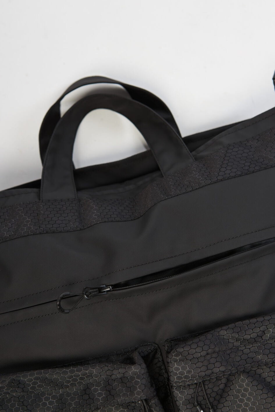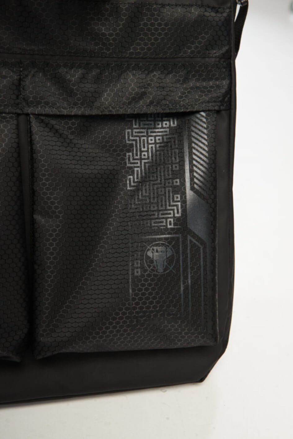 A spacious bag with multiple pockets. The main compartment has a zipper closure. Inside, there is a pocket for a laptop up to 16 inches, a small items pocket, and another zip pocket. On the outside, the bag has patch pockets on both sides: three on one side and two on the other, one of which has a black print. The side walls and bottom expand in width thanks to a zipper that can be unzipped.