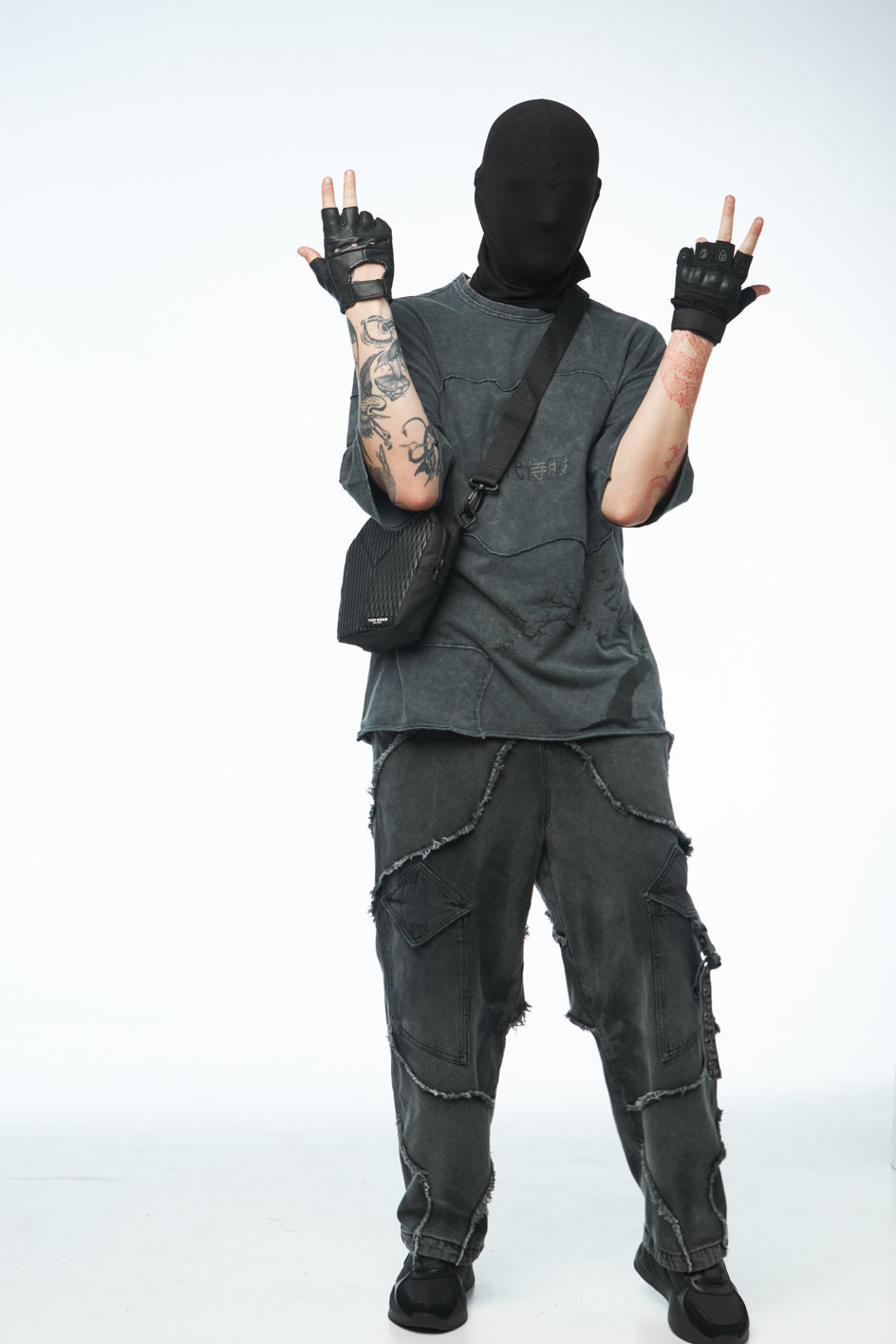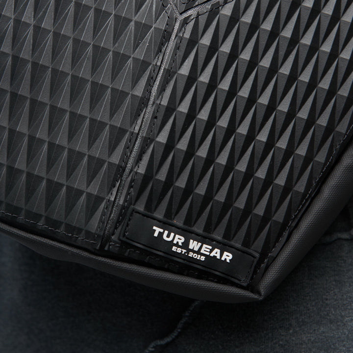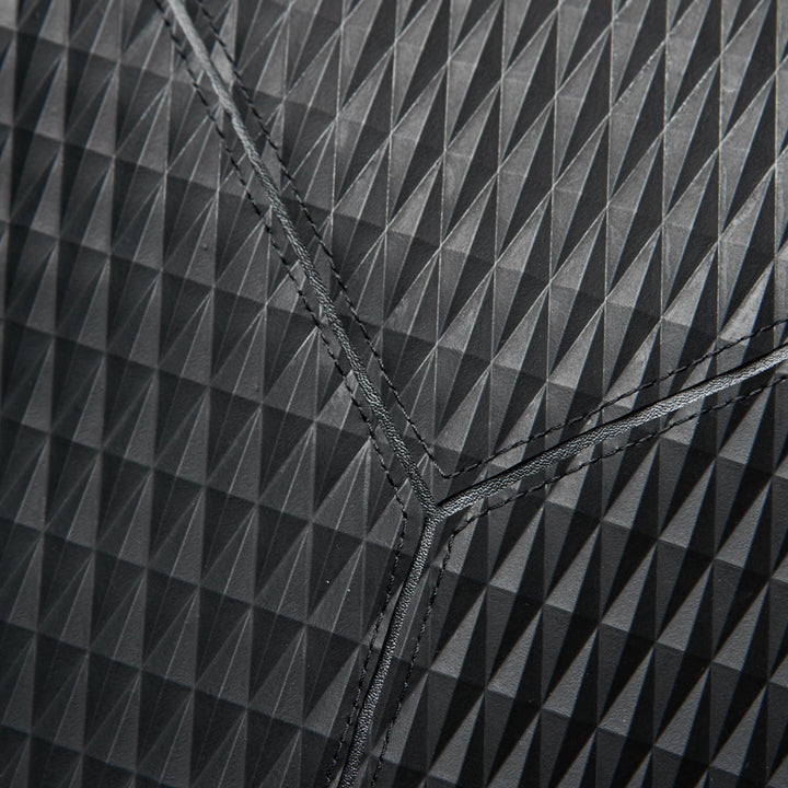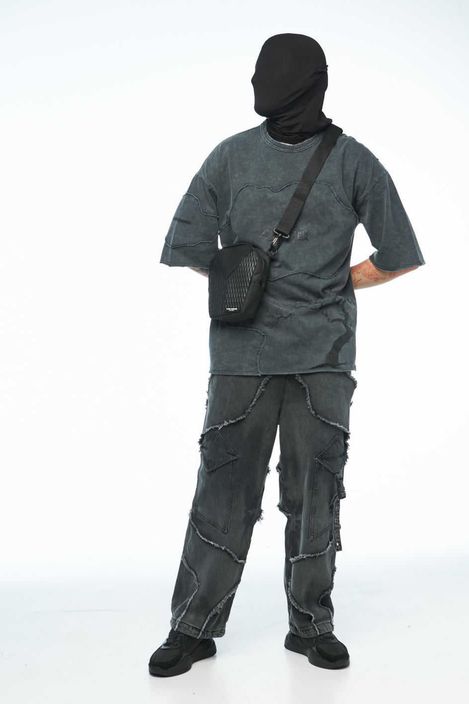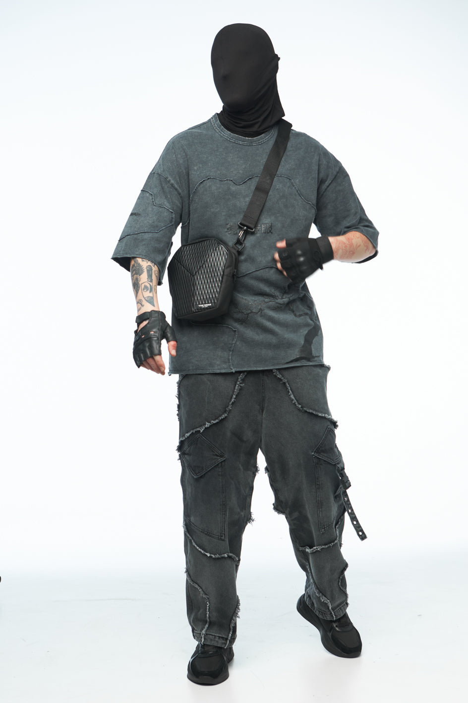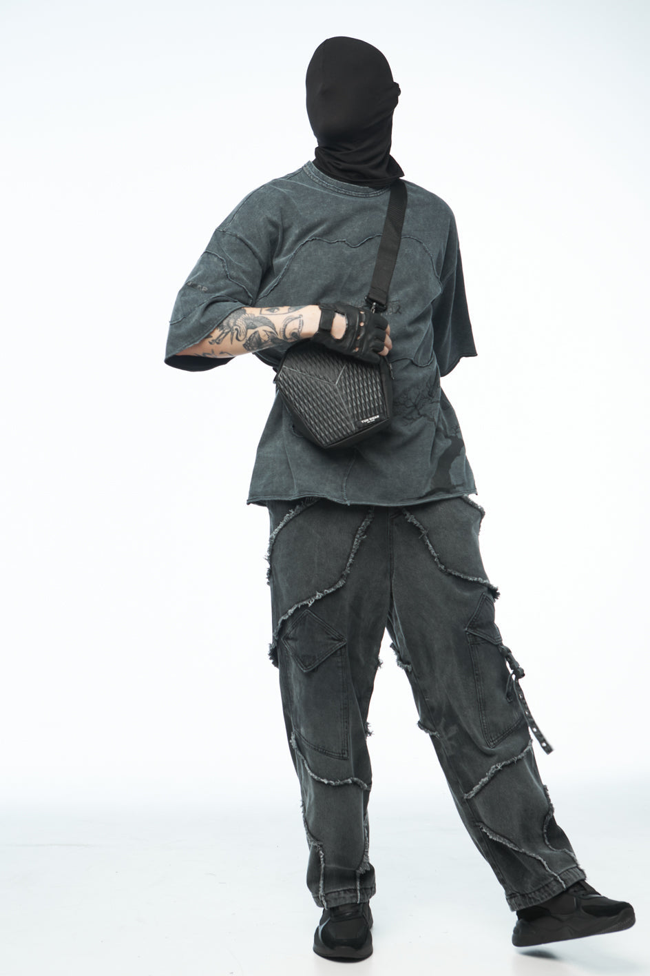 A textile shoulder bag combined with various materials. It has two internal pockets, a handle, and a detachable adjustable shoulder strap. The main compartment fastens with a zipper.